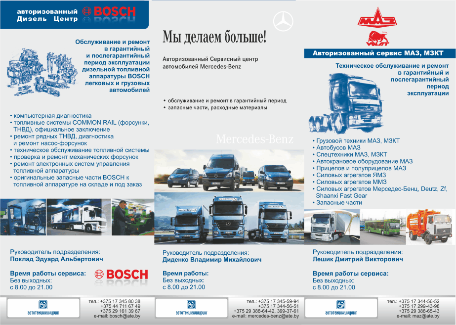 Сервисный центр СООО «Автотехинжиниринг» предлагает квалифицированное техническое комплексное обслуживание и ремонт Ваших автомобилей в гарантийный и после-гарантийный период, своевременную поставку оригинальных и высококачественных лицензионных запчастей.