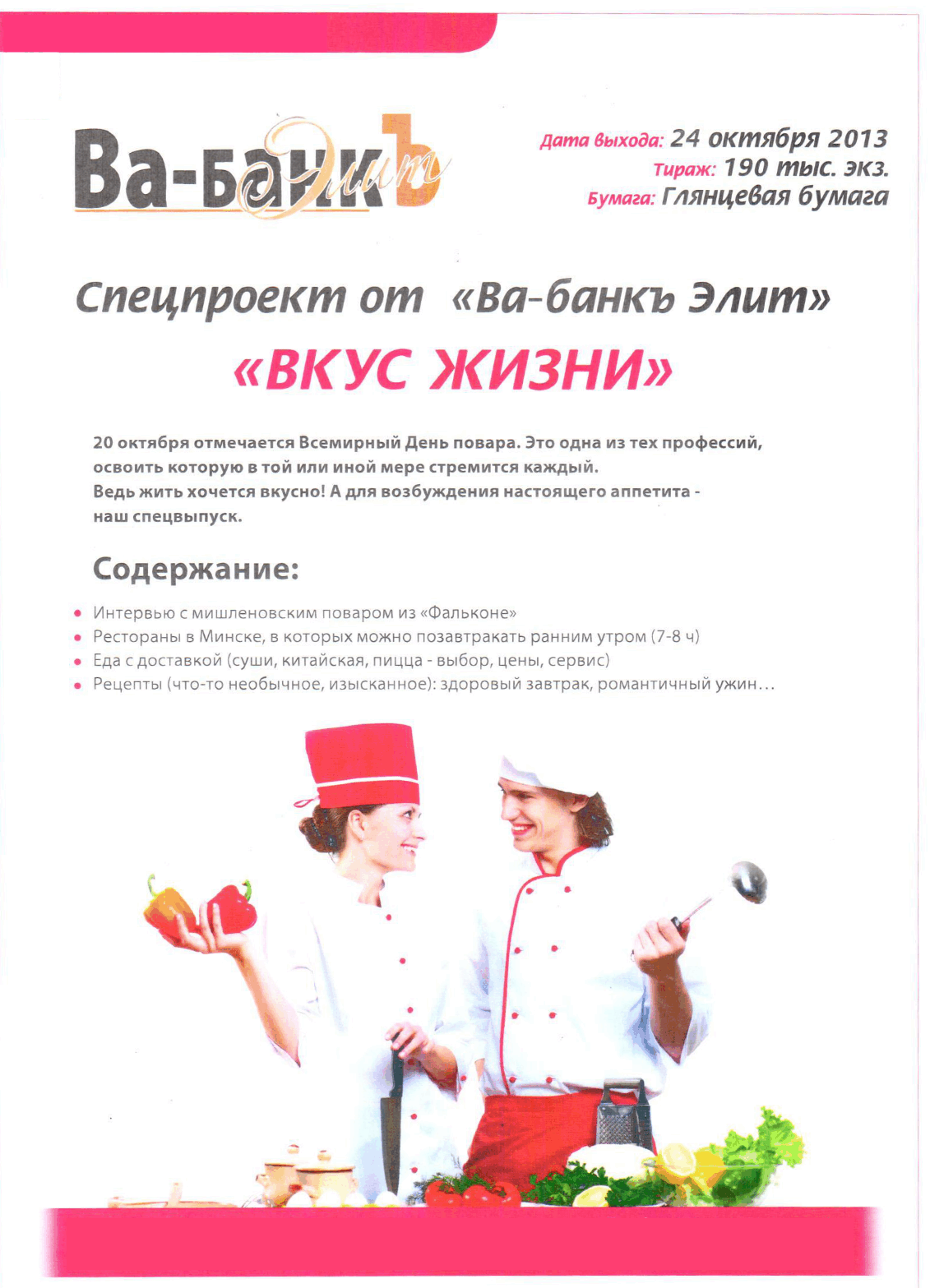 В октябре месяце в журнале “Ва-банк Элит” планируются спец.проекты на развороте.