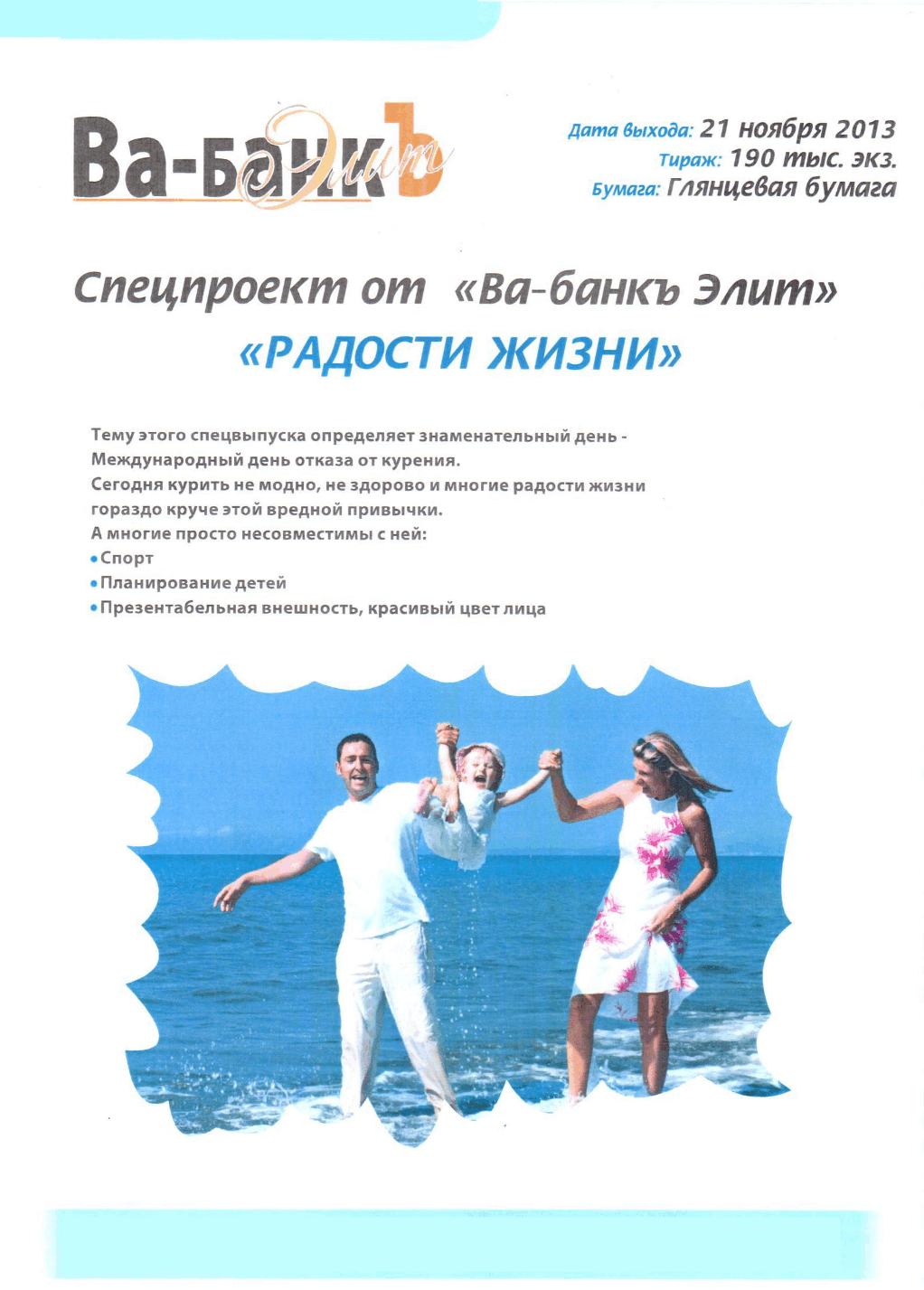 В ноябре месяце в журнале “Ва-банк Элит” планируются спец.проекты на развороте.