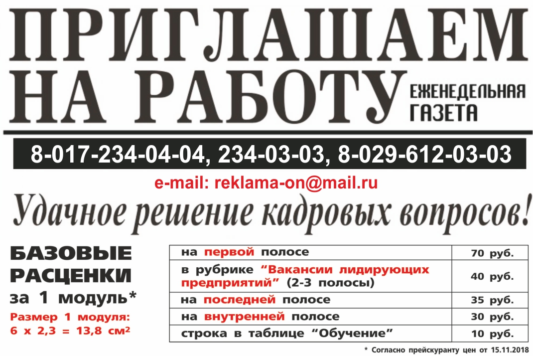 2018-11-16 газета Приглашаем на работу - изменение цен на размещение рекламы.