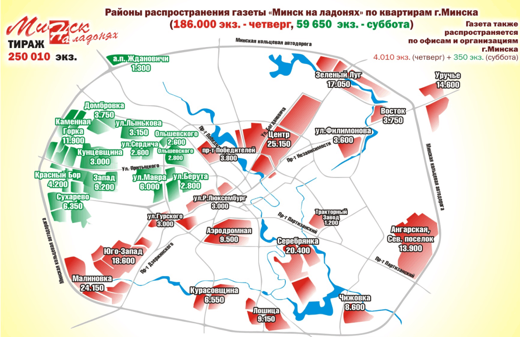 Распространяется в г. Минск собственной службой доставки по офисам (4 360 экз.) и квартирам (241 290 экз.).