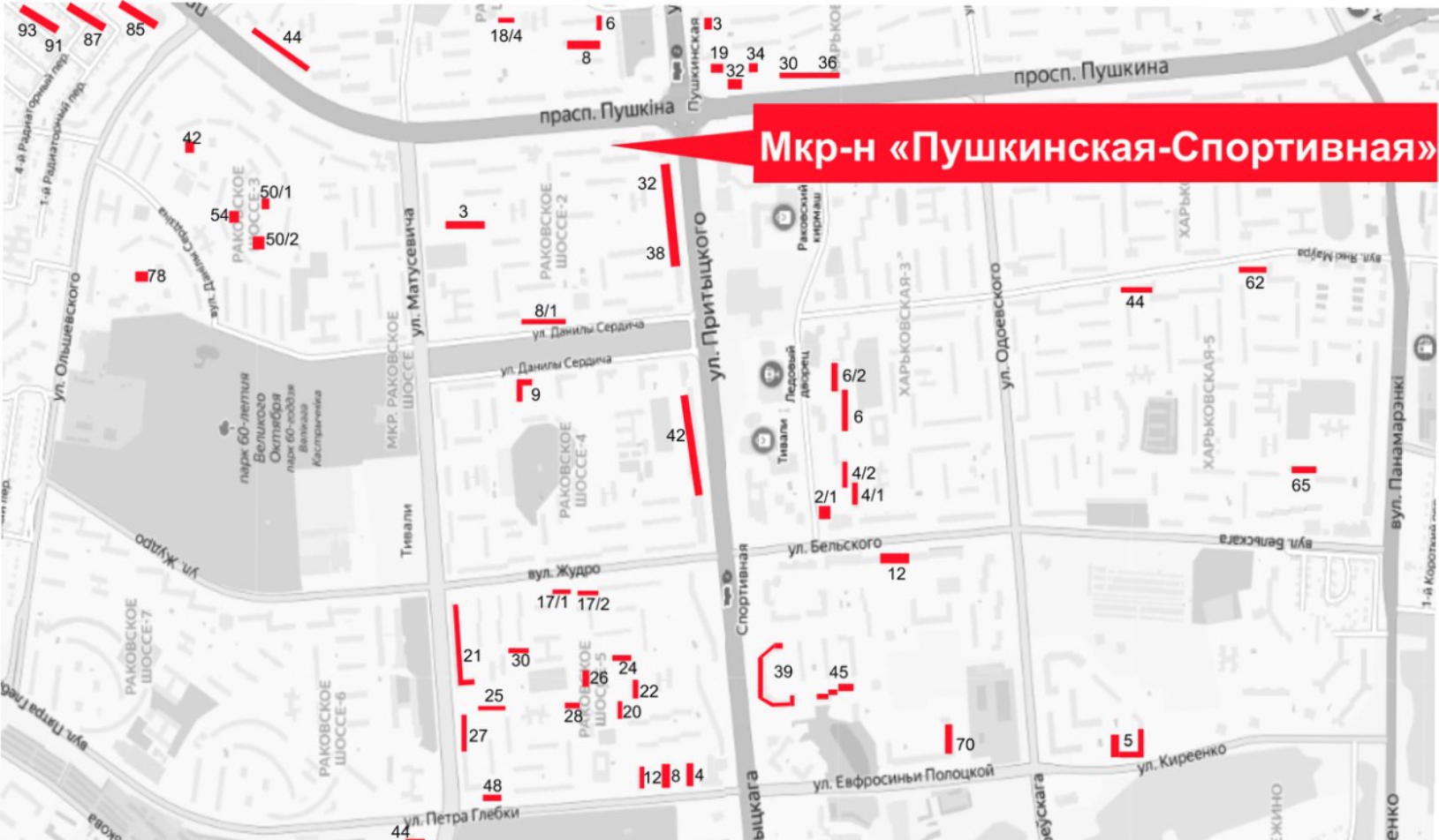 Притыцкого ул.: 6, 8, 18/4, 32, 38, 39, 42, 45, 46, 48;